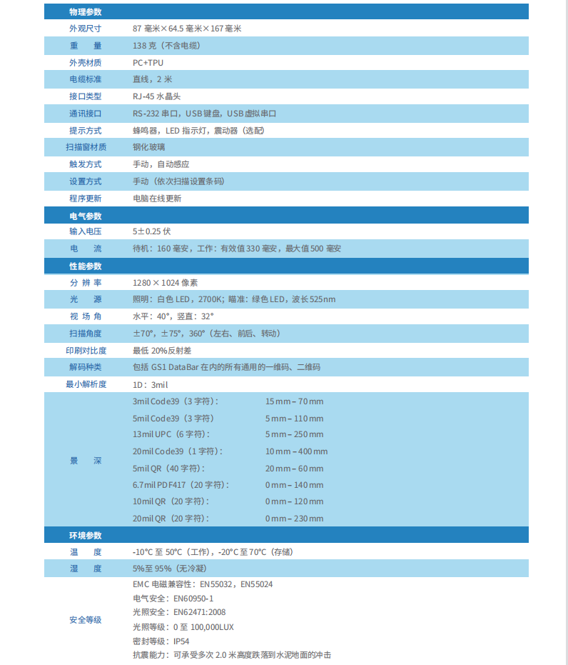 產品特點 1.卓越的 DPM 碼識讀能力,輕松應對各種精密電子制造應用場景 2.超高工業防護的結構設計,可承受 2 米高的反復跌落測試 3.采用影像式自動感應技術,可在免持與手持兩種模式之間自由切換 4.人性化的照明和對焦設計,帶來舒適便捷的掃描體驗